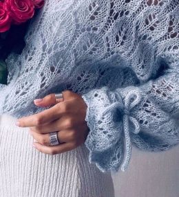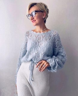 Очаровательный образ вязаного свитера спицами привлекает внимание нежной текстурой и воздушным узором. Легкий голубой оттенок и изящные завязки на манжетах дела...