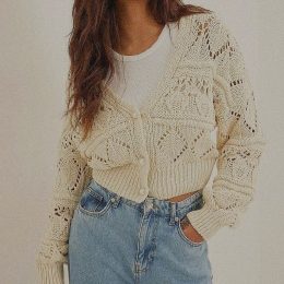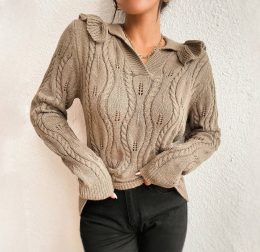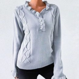 Начните с замечательной вышивки пуговиц на этом изделии. Вязаный свитер с нежными воланами на воротнике и манжетах придаёт образу элегантность и женственность....