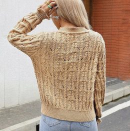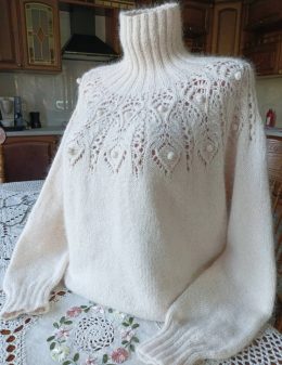 Волшебство вязания оживает в этом изысканном свитере с нежными ажурными узорами, которые напоминают снежные кружева. Великолепная стойка-воротник и мягкие объём...