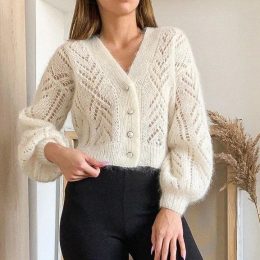На фоне темных брюк, белый вязаный кардиган создает заметный контраст. Пухлые рукава и ажурный узор добавляют изделию особый шарм. Укороченный кардиган с геомет...