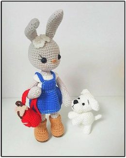 Этот уникальный вязаный зайчик в синем платье и рыжих сапожках носит красную сумочку, идеально сочетая стиль и очарование. Рядом с ним стоит милый белый щенок,...