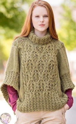 Начнем с мелкого узора на воротнике: этот вязаный свитер-пончо выделяется сложной вязкой и объемным рисунком. Свободный крой и теплый оливковый цвет делают его...