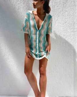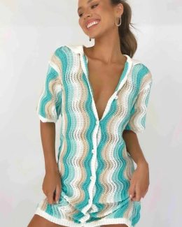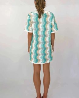 Это восхитительное вязаное платье, словно создано для тёплых летних дней. Яркие бирюзовые и бежевые волны придают ему лёгкость, а свободный крой и воздушная вяз...