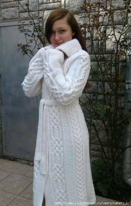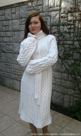 Этот вязаный халат словно создан для зимней сказки. Объемные косы и мягкие рукава придают ему особый шарм и уют. БЕЛОЕ ПАЛЬТО АРАНАМИ. ** #пальто #кардиган #вяз...