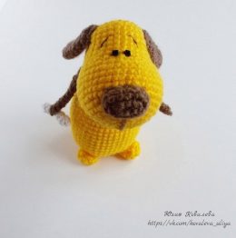 Очаровательный образ вязаного пёсика, выполненного в ярко-жёлтом цвете, привлекает внимание милыми деталями. У него коричневые ушки и нос, а в лапке он держит м...