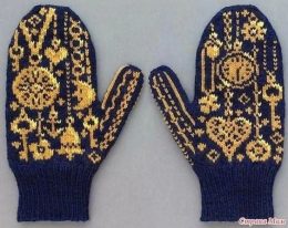 Вы только посмотрите на эти великолепные варежки! Они украшены замысловатыми золотыми узорами, среди которых можно заметить ключи и сердечки. Такой аксессуар то...
