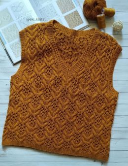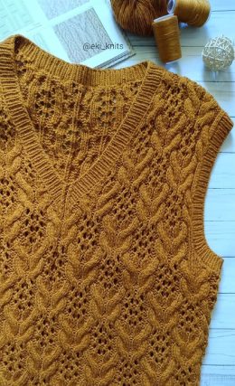 Этот вязанный жилет идеально подойдёт для создания уютных и стильных образов в прохладные дни. Изящный узор с листочками и комфортная V-образная горловина делаю...