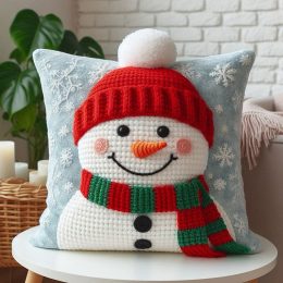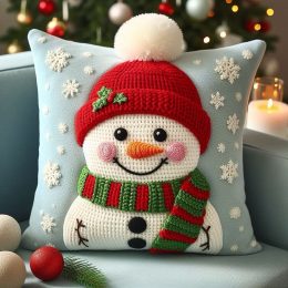 Интересный факт: вязание крючком — одно из древнейших ремесел, которое зародилось в 16 веке. Эта подушка с изображением снеговика имеет яркую красную шапку и по...