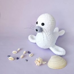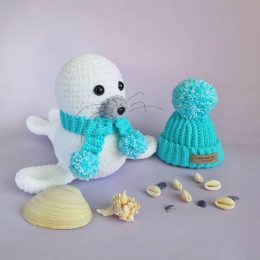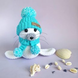 Этот милый вязаный тюлень, одетый в бирюзовый шарф и шапочку с помпоном, словно приглашает вас на снежные забавы. Его дружелюбные глаза и длинные усики добавляю...
