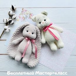 На фоне белого стола выделяются два игрушечных персонажа: зайчик и мишка, выполненные из мягкой пряжи. У зайчика длинные ушки, а у мишки розовый бантик. Зайка и...