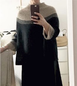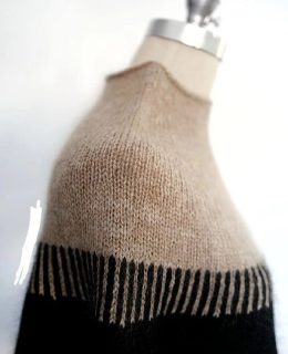 Этот свитер, выполненный спицами, отличается заметным контрастом между черным и светло-бежевым цветами. Дизайн включает интересные полосы на плечах и манжетах,...