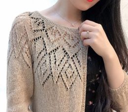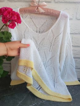 Это произведение рукоделия создано спицами, и его уникальный подход заключается в сочетании ажурных узоров с геометрическими мотивами, которые придают изделию с...
