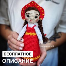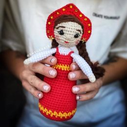 Эта очаровательная вязаная кукла в традиционном русском костюме привнесет тепло и уют в ваш дом. Ярко-красный сарафан, украшенный желтыми акцентами, и кокошник...