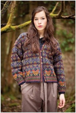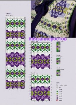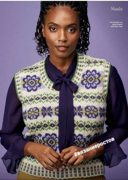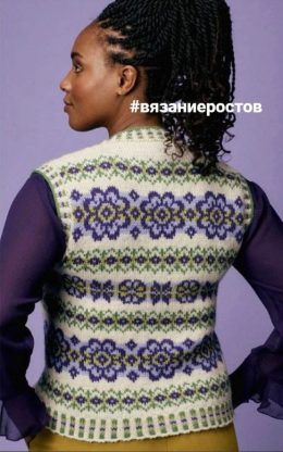 Очаровательный образ с вязаным жилетом, который сочетает в себе яркие цветочные узоры и контрастные оттенки зелёного, фиолетового и белого. Жилет выделяется акк...