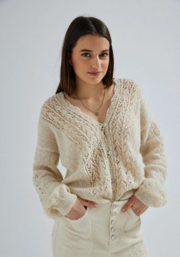 Пусть этот уютный кардиган согревает вас в прохладные дни! Обратите внимание на ажурные рукава, которые добавляют изюминку, и нейтральный цвет, подходящий к люб...