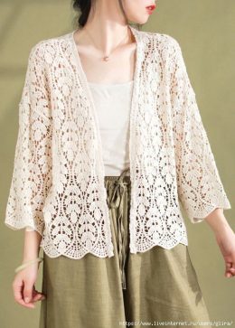 Этот воздушный кардиган, связанный крючком, словно кружевная паутина, окутывает плечи. Изящные узоры напоминают о танце ветра среди ветвей, а широкие рукава доб...