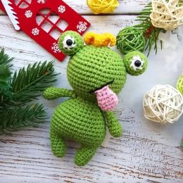 На макушке забавного лягушонка притаился жёлтый бантик, добавляя озорства его образу. Ярко-зелёная вязка и комично высунутый розовый язык делают игрушку особенн...