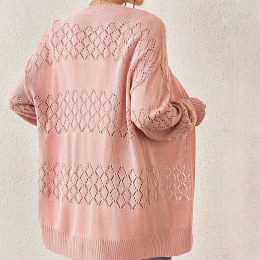 Эта нежно-розовая вязаная спицами кофта привлекает внимание своим ажурным узором. Широкие полосы чередуются с изысканными ромбами, создавая воздушный и легкий о...