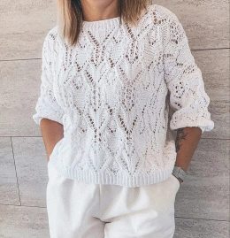 Какое восхитительное изделие! Этот белоснежный вязаный свитер впечатляет своим сложным узором и воздушной текстурой. Обратите внимание на аккуратные рукава и ши...