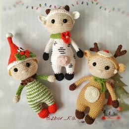 Эти очаровательные вязаные игрушки словно сошли со страниц зимней сказки. Рождественский эльф в шапочке с красным цветком, коровка с сердечком и олень с забавны...