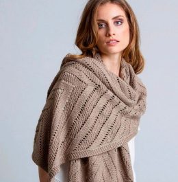 Позвольте этой шали окутать вас теплом и нежностью, как солнечный луч в прохладный день. Восхитительная вязка спицами создает сложный геометрический узор, котор...