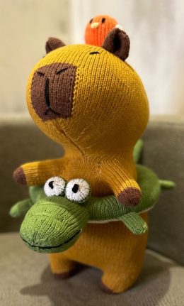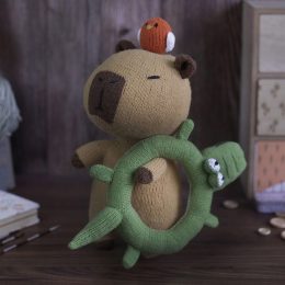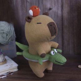 Забавная вязаная капибара в нежно-коричневых тонах уверенно держится на зеленом крокодиле-спасательном круге. На её голове уютно устроилась маленькая птица, доб...