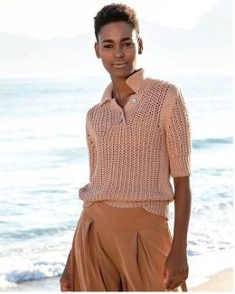 Волшебство спиц оживает в этом удивительном вязаном свитере с короткими рукавами. Изюминка дизайна — оригинальная текстура и элегантный воротник на пуговицах, к...