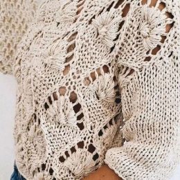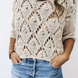 Этот вязаный свитер спицами очаровывает уникальным подходом к узорам. Крупные ажурные ромбы создают эффектный вид, а сочетание плотной вязки и открытых участков...
