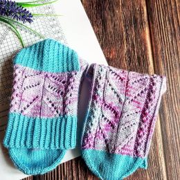 Эти вязаные носки поражают удивительным сочетанием ярких цветов и изящного узора. Их особенность — плавный переход оттенков от насыщенного бирюзового к нежно-ро...