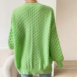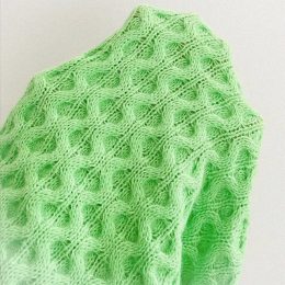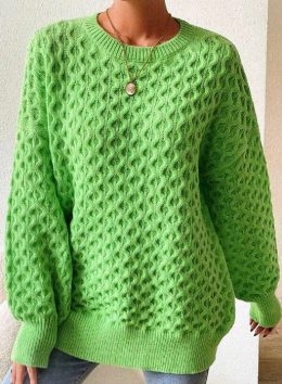 Этот ярко-зеленый свитер, связанный спицами, привлекает внимание своим сложным переплетением узоров. Объемные рукава и свободный крой делают его не только стиль...