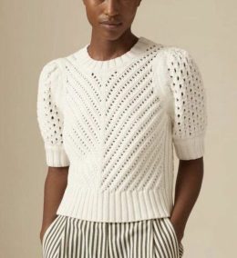 Свитер, как книга, где каждая петля — это история, рассказывающая о тепле и уюте. Этот изящный белый вязаный топ с короткими рукавами и ажурным узором привлекае...