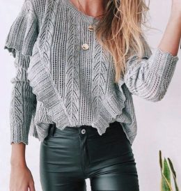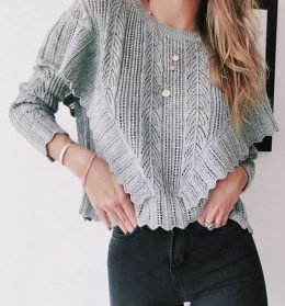Помню, как бабушка вязала свитер, и кот постоянно пытался украсть клубок ниток. Этот серый вязаный шедевр с рюшами и узором напоминает о тех забавных моментах....