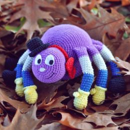 Этот милый фиолетовый паучок с черной шляпой и красным галстуком-бабочкой обязательно поднимет настроение.