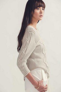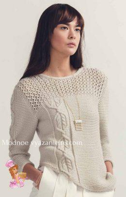 Красивый топ спицами с рисунком на передней части изделия. Основной узор: ширина 13 п. 1-й (лиц.) ряд: 1 изн., 5 лиц., 4 накида, 1 протяжка (снять 1 п., 1 лиц.,...