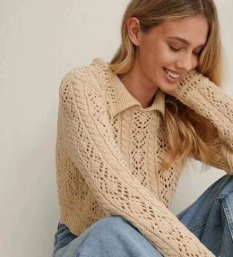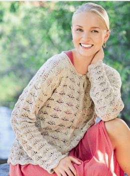 Этот пуловер выполнен спицами из мягкой пряжи с изящным ажурным узором, который придает изделию легкость и воздушность. Особенность модели — аккуратный отложной...