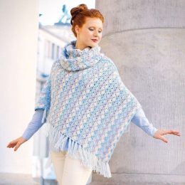 Это изысканное пончо связано крючком из мягкой пряжи с переходом цвета в нежных голубых и кремовых оттенках. Уникальная фактура создается за счет объемного узор...