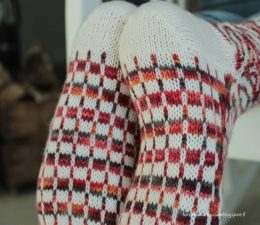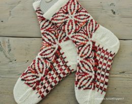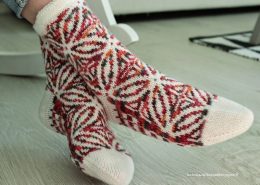 Эти носки выделяются сложным жаккардовым узором, выполненным в теплых оттенках красного, оранжевого и коричневого на светлом фоне. Особое внимание уделено детал...
