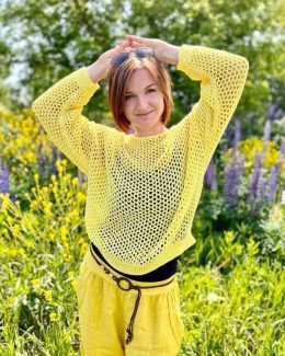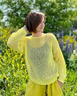 Свободный свитер с крупной вязкой сеткой из ярко-желтой пряжи, создающий легкую и воздушную текстуру. Особенность модели — сочетание открытой структуры с плотно...