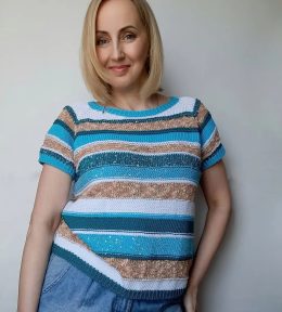 Этот стильный топ выполнен из мягкой пряжи с чередованием текстурных полос в бирюзовых, белых и бежевых тонах. Особенность модели — сочетание разных узоров вязк...