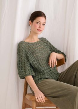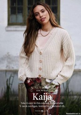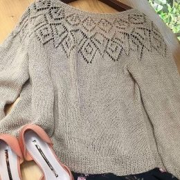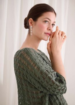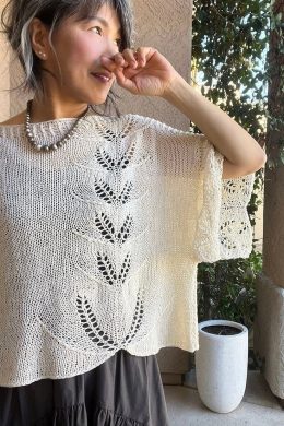 Этот легкий пуловер связан спицами с использованием ажурного узора в виде листьев, который придает изделию воздушность и изящество. Особенность модели — асиммет...