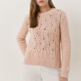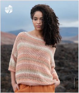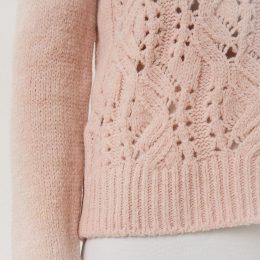 Очаровательный пуловер выполнен из мягкой пряжи с эффектом градиента в теплых персиковых и кремовых тонах. Особенность модели — крупная ажурная вязка, создающая...