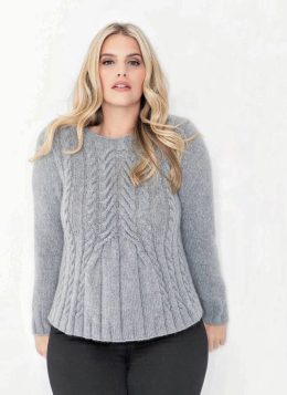Элегантный серый свитер выполнен из мягкой пряжи с выразительным узором из объемных кос, плавно переходящих в аккуратные плиссировки по низу. Длинные рукава и с...