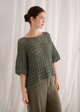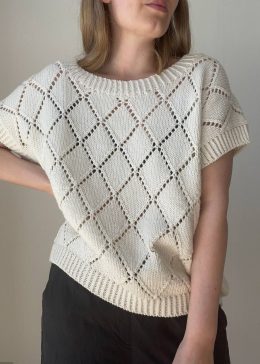 Этот воздушный топ выполнен из мягкой пряжи с выразительным ажурным узором в виде ромбов, создающим эффект легкости и элегантности. Особенность модели — коротки...