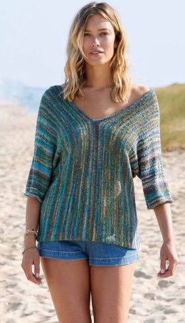 Вспоминается летний день у моря, когда легкий бриз играл с нитями этого пуловера, а его объемный узор «косы» словно отражал ритм волн. Широкие рукава и V-образн...