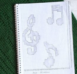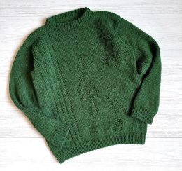 Этот вязаный свитер выполнен из плотной пряжи насыщенного зеленого цвета и украшен рельефным узором в виде музыкальных нот, что придает изделию уникальный харак...