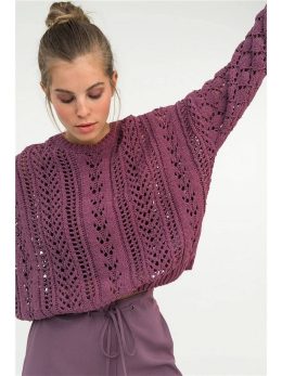 Объемный пуловер выполнен из мягкой пряжи насыщенного сливового оттенка с выразительным ажурным узором, создающим эффект легкости и воздушности. Модель отличает...