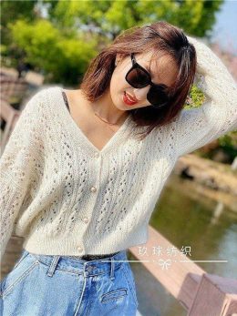 Мягкий вязаный кардиган из тонкой пряжи с ажурным узором и декоративными жемчужными пуговицами, создающими изящный акцент. Жакет. Схема.