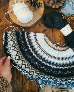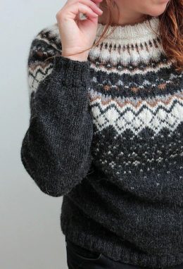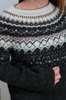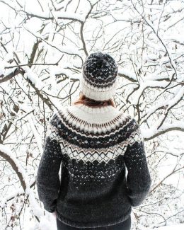 Теплый свитер, связанный спицами из мягкой пряжи с традиционным жаккардовым узором в черно-белой гамме. Особенность модели — широкая резинка по низу и рукавам,...