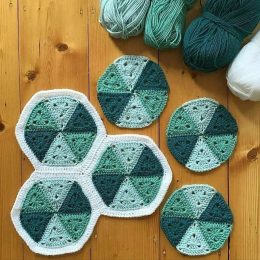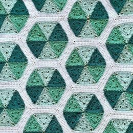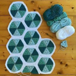 Интересная идея создания пледа из мотивов. Вяжем треугольники по схеме (2 ряда). Из треугольников формируем шестиугольник, обвязываем и соединяем.