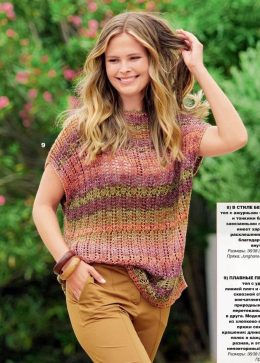 Уникальный узор из ажурных мотивов придает изделию воздушность и изящество, а сочетание нежных оттенков создает гармоничный образ. Короткие рукава и свободный к...